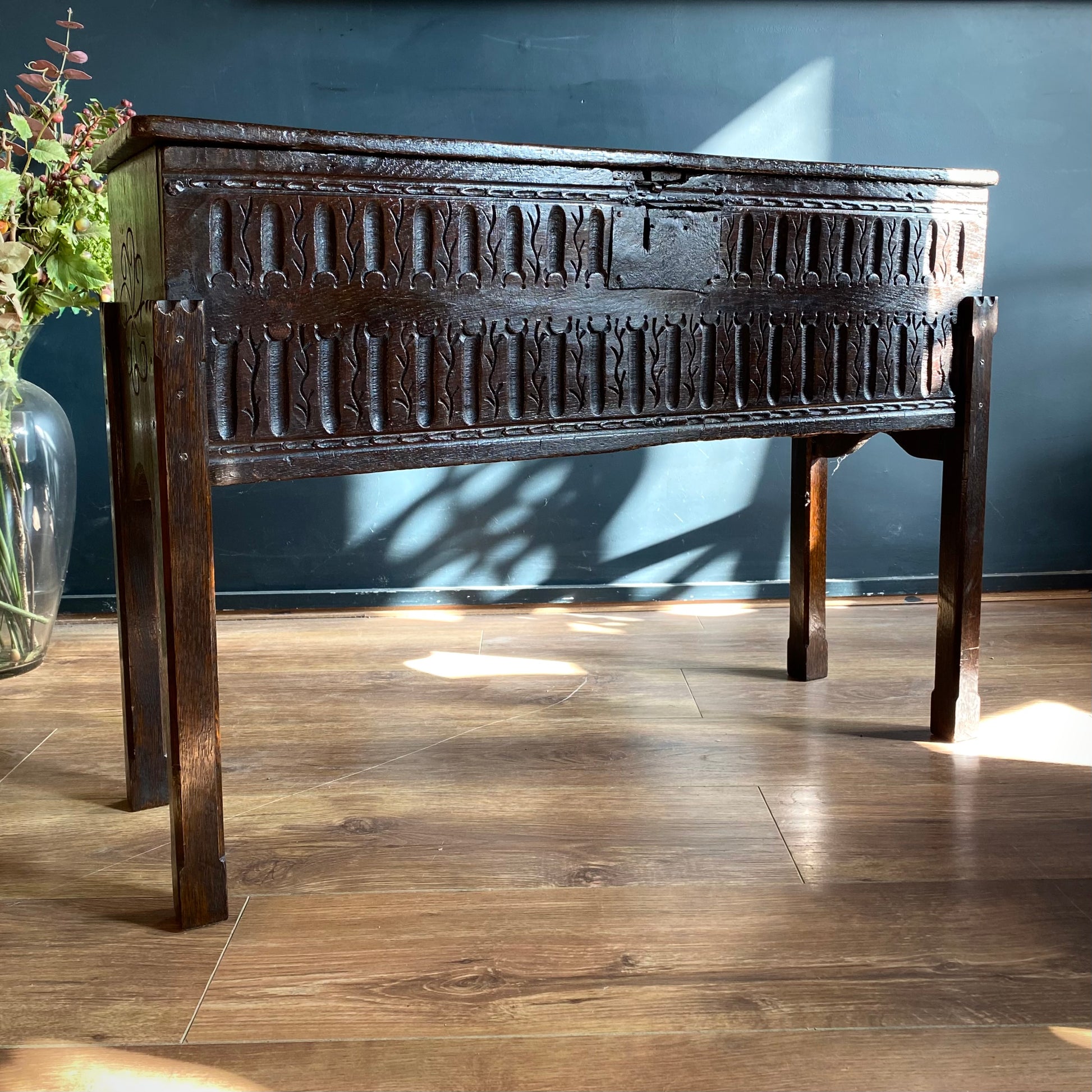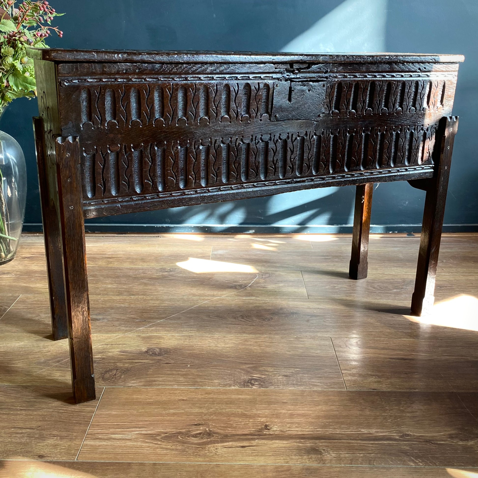 This smaller size coffer, sat over 4 square form legs (added at a later period) boasts intricate carved relief of flower head stems, flanked either side by a chequer patterned moulded edge, along the hinged lid.