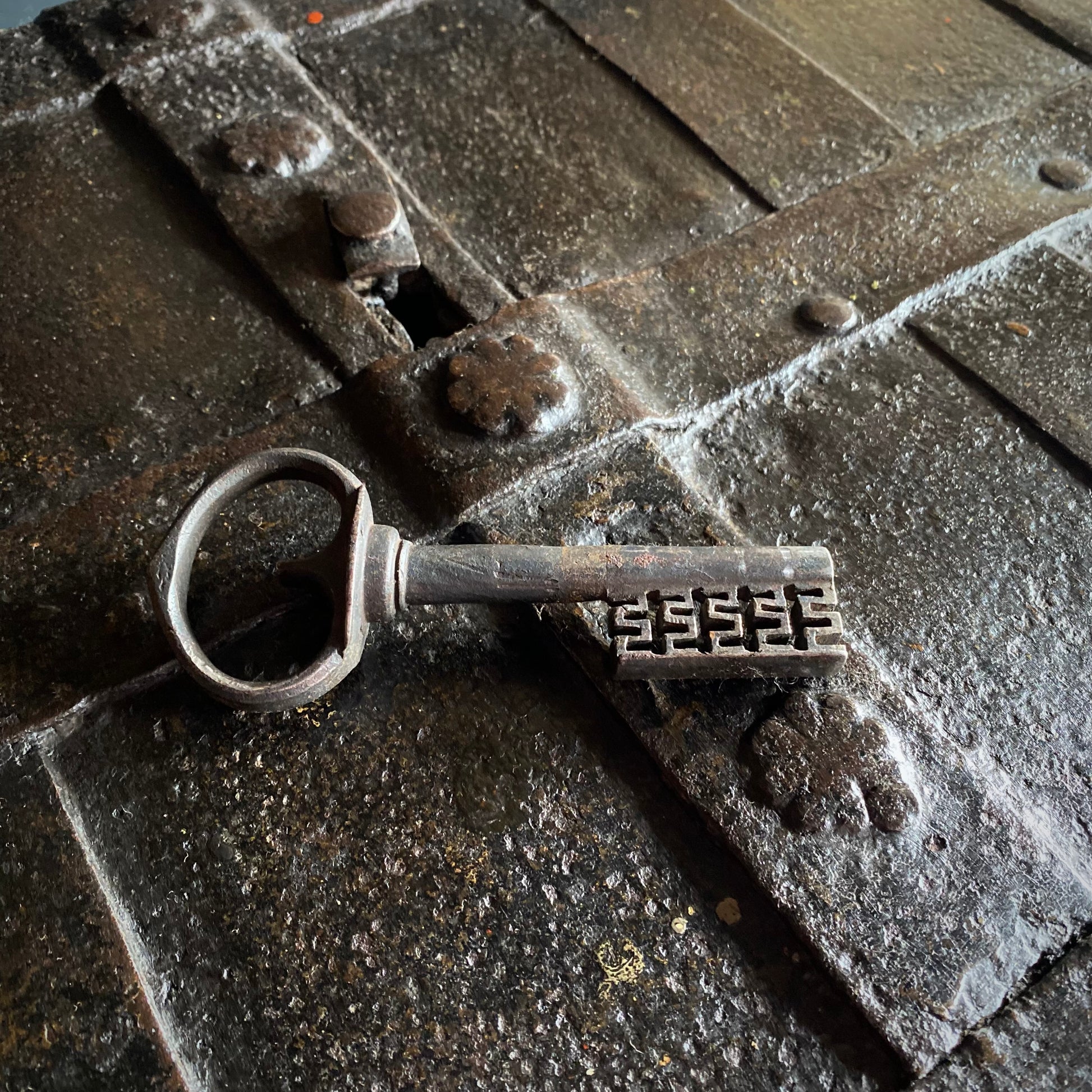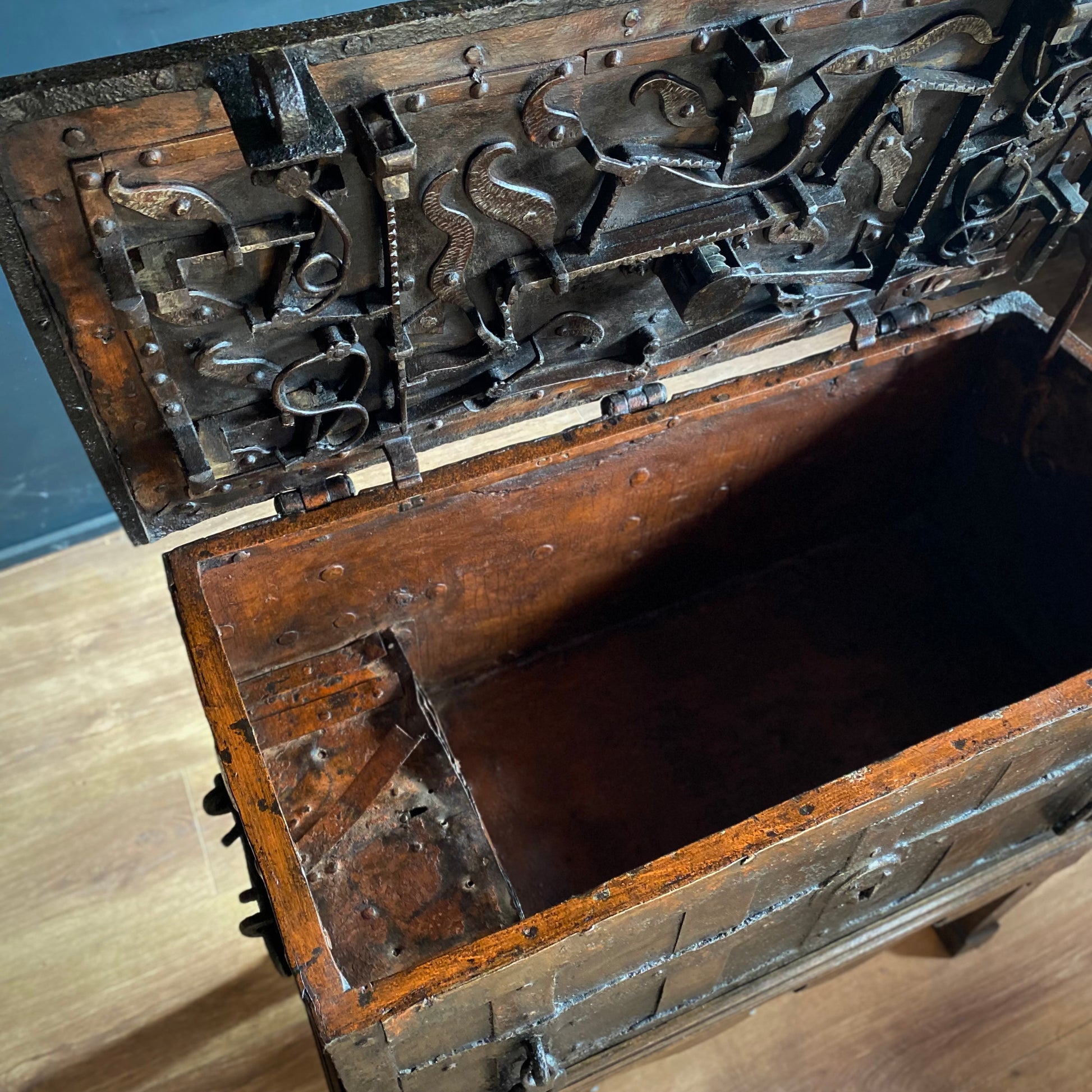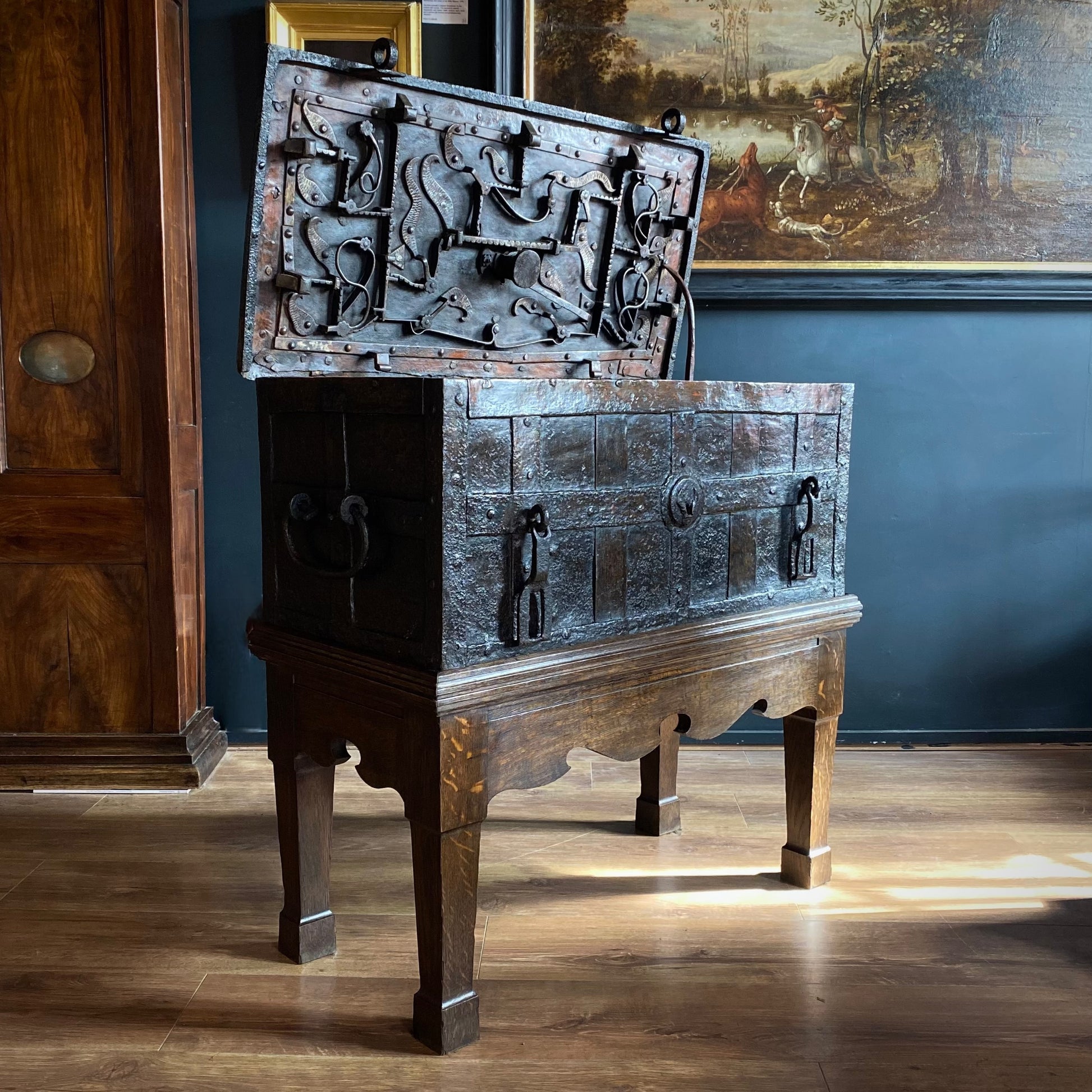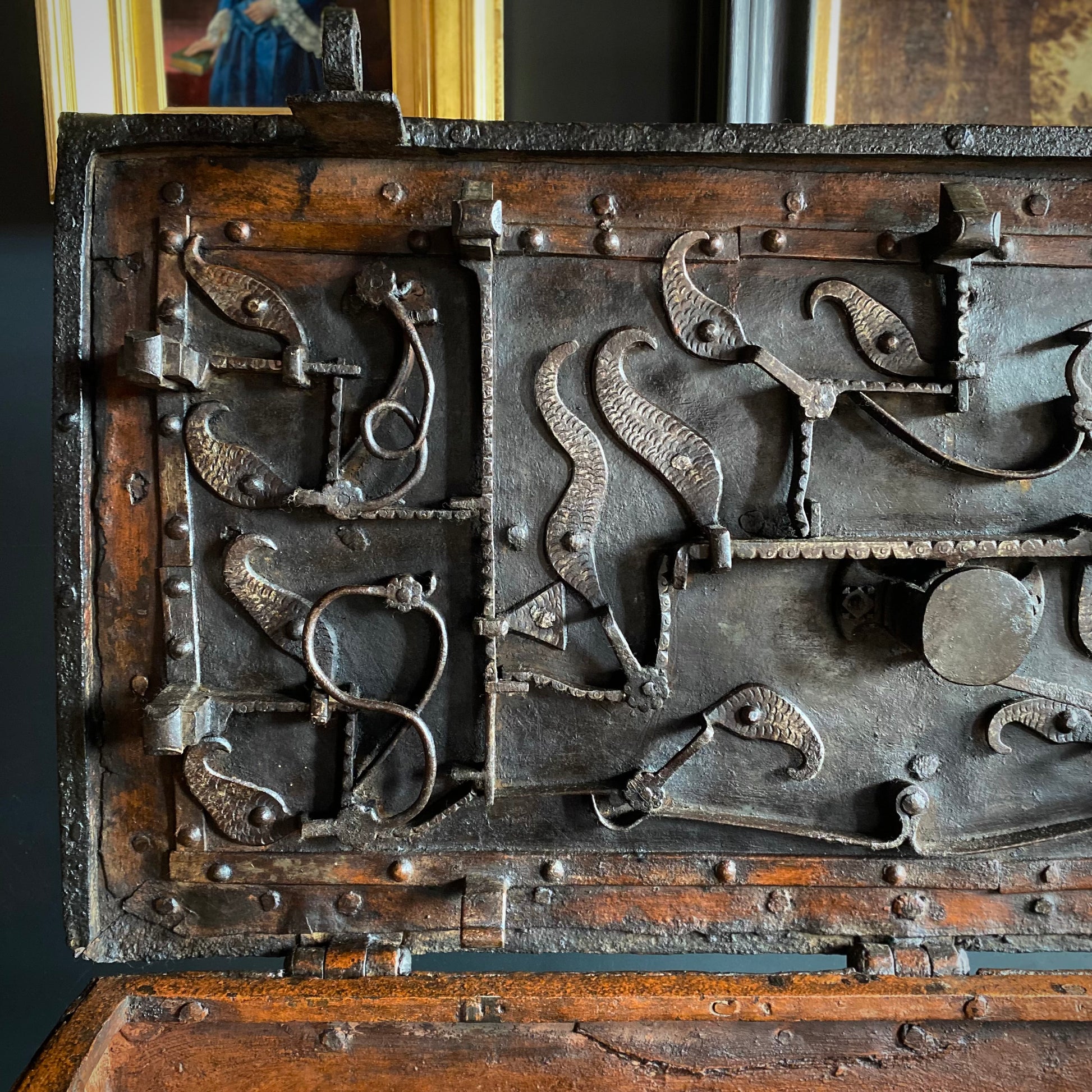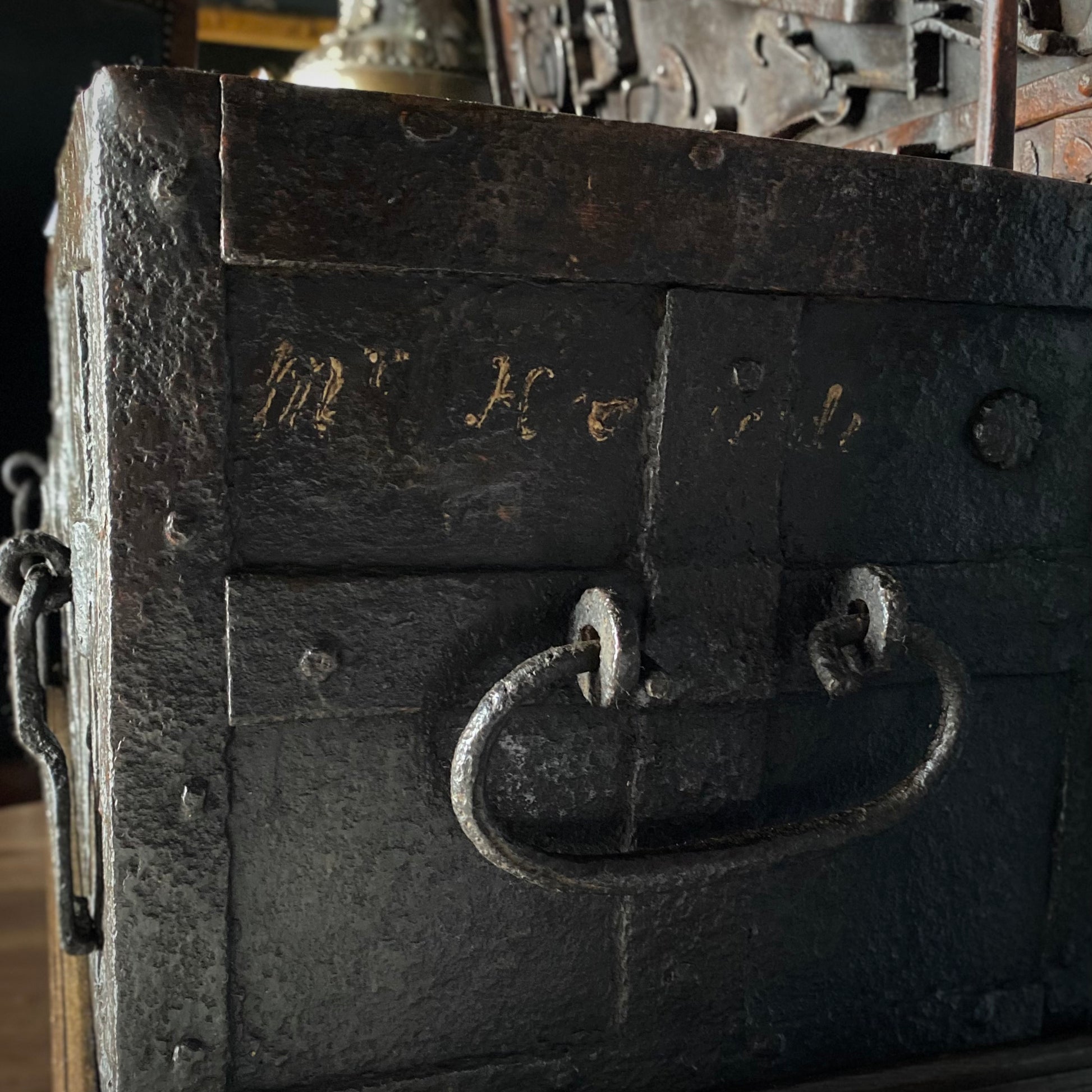 This fascinating wrought iron trunk would have served as a safe place to store, carry and transport gold and silver for trade purposes aboard ships and vessels across the seas, into the 17th century.