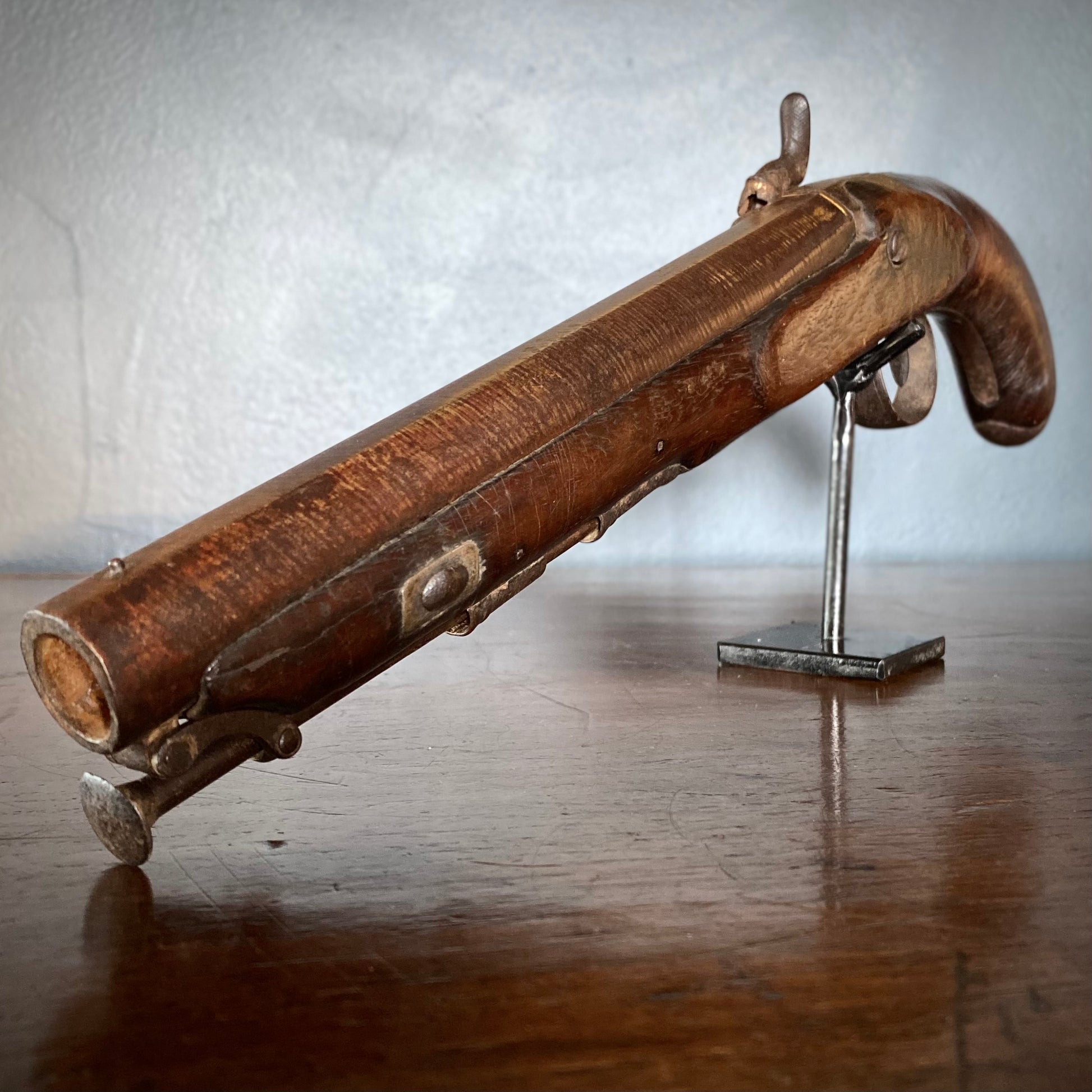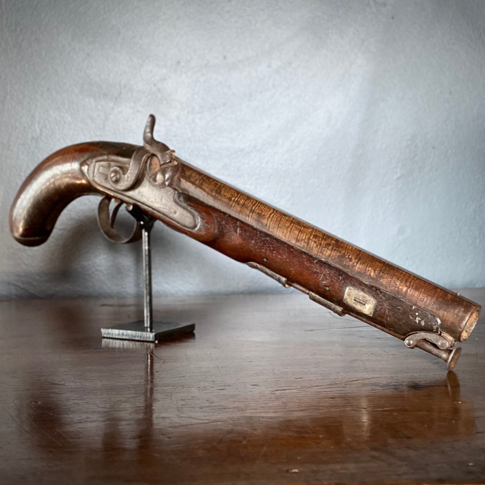 This fine display piece is 14 inches overall (36cm), and features a stunning 9 inch (23cm), sighted .6 calibre, Damascus barrel, behind which a full walnut stock with a beautifully worn chequered grip is situated.