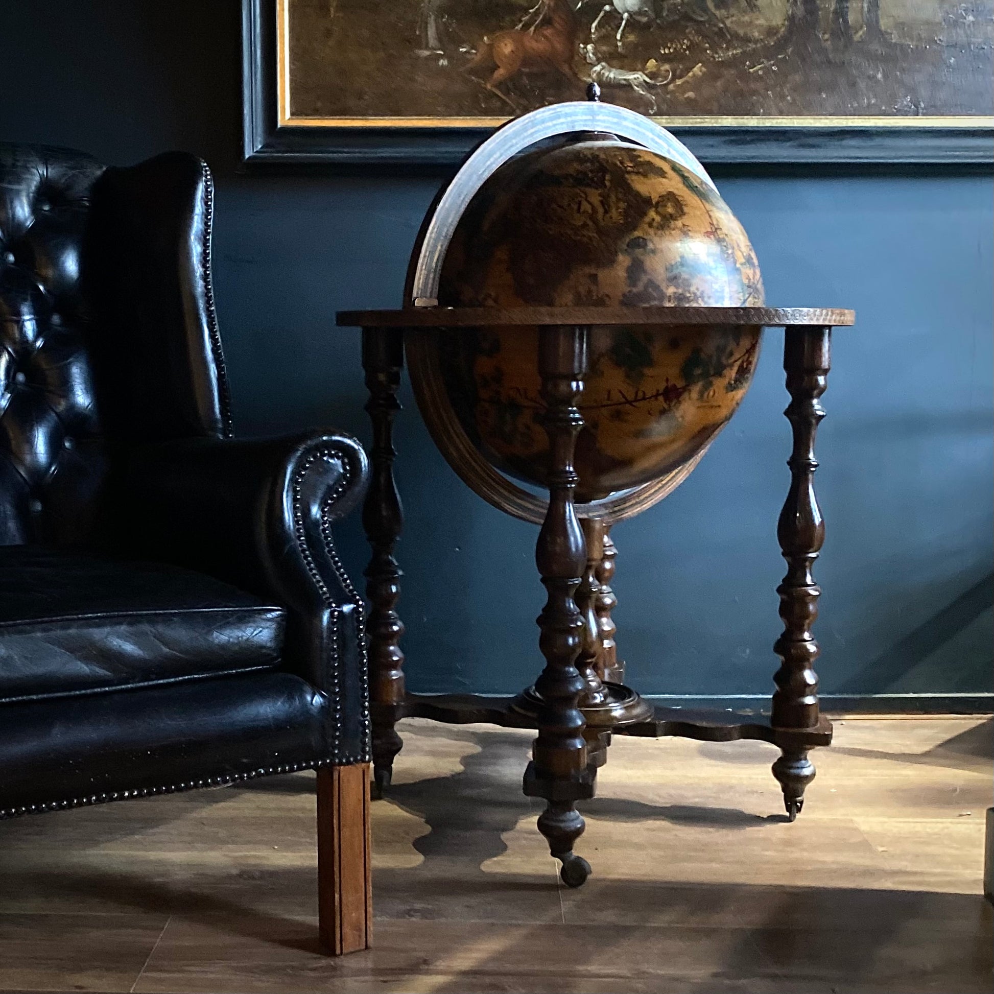 The globe stands over mahogany legs, with 'X' stretcher between them. Situated underneath are four casters for easy movement. A very versatile addition to any study, recreational or library space.