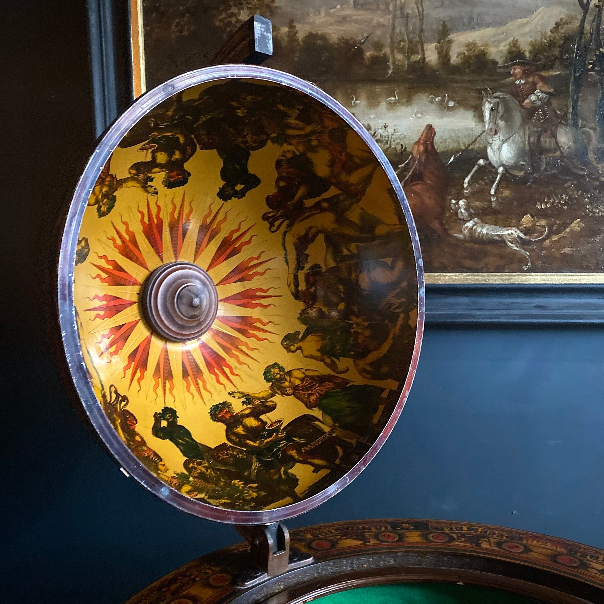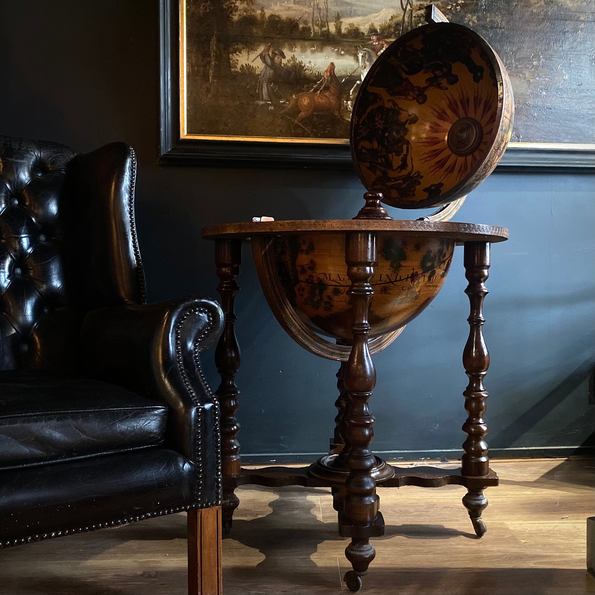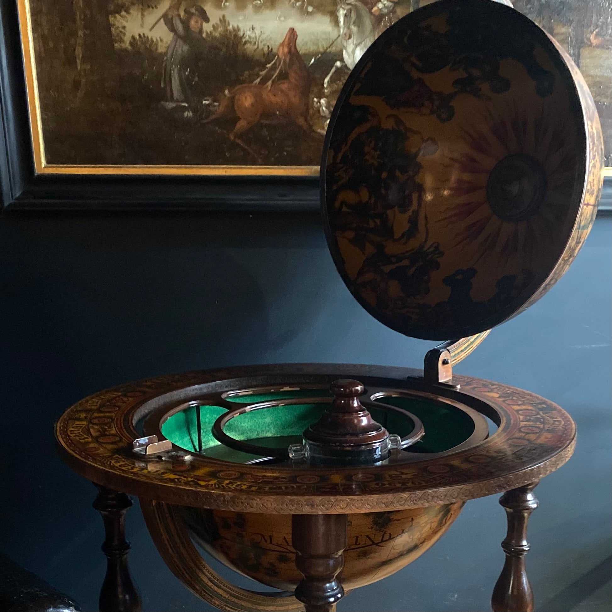 This handsome vintage piece is decorated with Zodiac themed artwork around its perimeter and across the face of the globe. The top half opens to reveal storage for bottles, and a glass ice bucket with steel lid, over a green baize felt lined inner section.